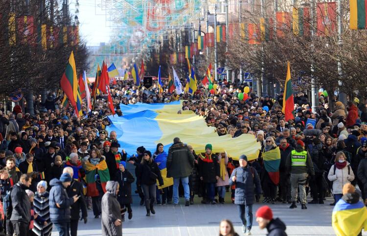 People walk with a giant many meter-long Ukrainian flag to protest against the Russian invasion of Ukraine during a celebration of Lithuania's independence in Vilnius, Lithuania, on March 11, 2022. (Photo by PETRAS MALUKAS / AFP)