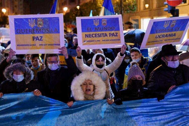 Demonstrators gather and hold signs during a protest against Russia's invasion of Ukraine in the city center of Burgos, northern Spain on March 12, 2022. (Photo by CESAR MANSO / AFP)