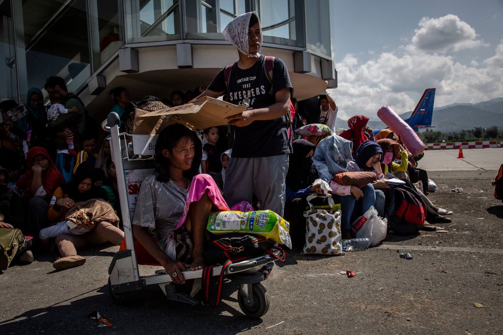 People gather on the apron as they wait to be evacuated by military aircraft at the quake-damaged Mutiara Sis Al Jufri airport in Palu, Indonesia's Central Sulawesi on September 30, 2018. (ADEK BERRY / AFP)