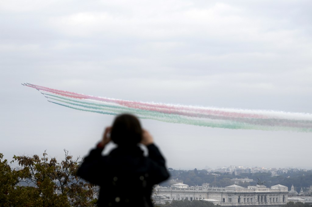 An onlooker takes a picture of the jets of the Italian Air Force aerobatic unit Frecce Tricolori (Tricolor Arrows) spreading smoke with the colors of the Italian flag as they fly over the city of Rome during the Armed Forces Day marking the end of World War I for Italy, on November 4, 2020. Filippo MONTEFORTE / AFP