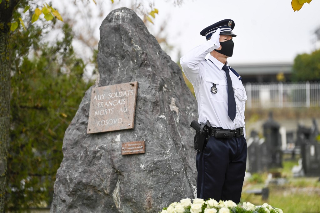 A member of the French national police stands to attention as he take part in a ceremony for the French soldiers of the Front d'Orient (1915-1918) who died in Kosovo, at the Military square in Pristina on November 11, 2020, during the Armistice Day commemorations marking the 102nd anniversary of the end of WWI (World War One). Armend NIMANI / AFP