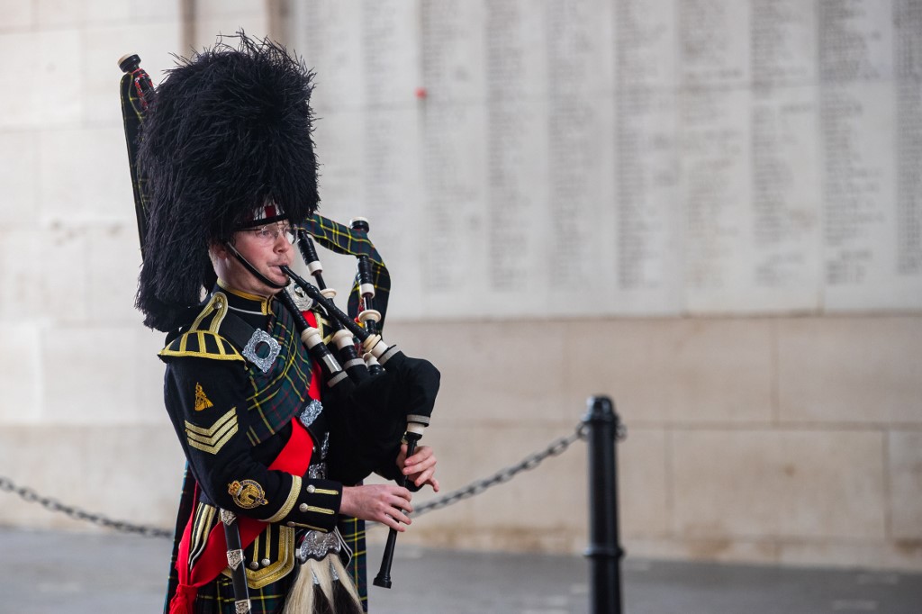 Belgian piper Gil Vermeulen plays the pipes during the Last Post ceremony at the Commonwealth War Graves Commission Ypres Memorial at the Menin Gate in Ypres on November 11, 2020 on the occasion of the commemorations marking the 102nd anniversary of the November 11, 1918 Armistice, ending World War I (WWI). Kurt DESPLENTER / BELGA / AFP