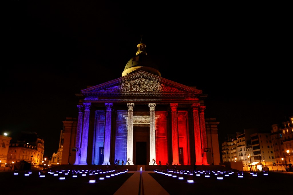 The colours of the French flag are projected on the facade of the Pantheon mausoleum during a national tribute for Late French writer Maurice Genevoix and 'Men of 14' as part of Armistice Day commemorations marking the end of World War I, on November 11, 2020, in Paris, as part of the commemorations marking the 102nd anniversary of the November 11, 1918 Armistice, ending World War I (WWI). CHRISTIAN HARTMANN / POOL / AFP