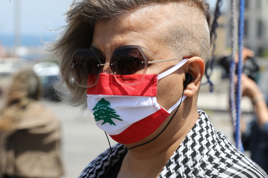 A Lebanese anti-government protester wearing a protective mask designed as a national flag amid the COVID-19 pandemic, takes part in a demonstration in downtown Beirut, on May 1, 2020, marking International Workers' Day (Labour Day). ANWAR AMRO / AFP