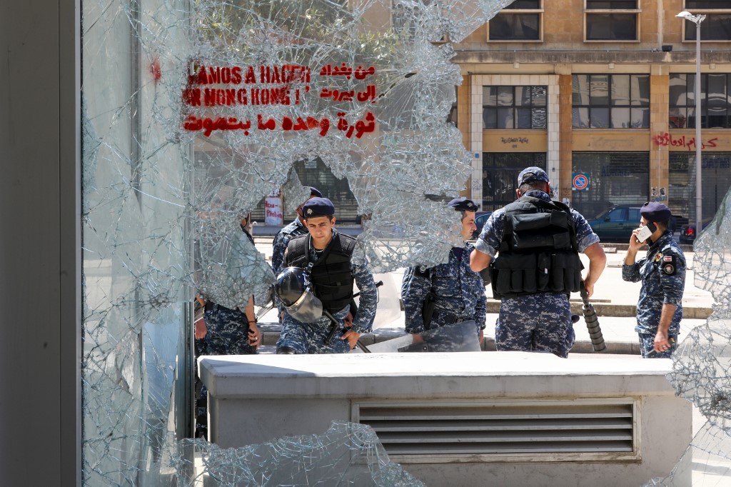 Members of the Lebanese security forces are seen through a broken store window in the downtown area of the capital Beirut, during an anti-government demonstration marking International Workers' Day (Labour Day), on May 1, 2020. ANWAR AMRO / AFP
