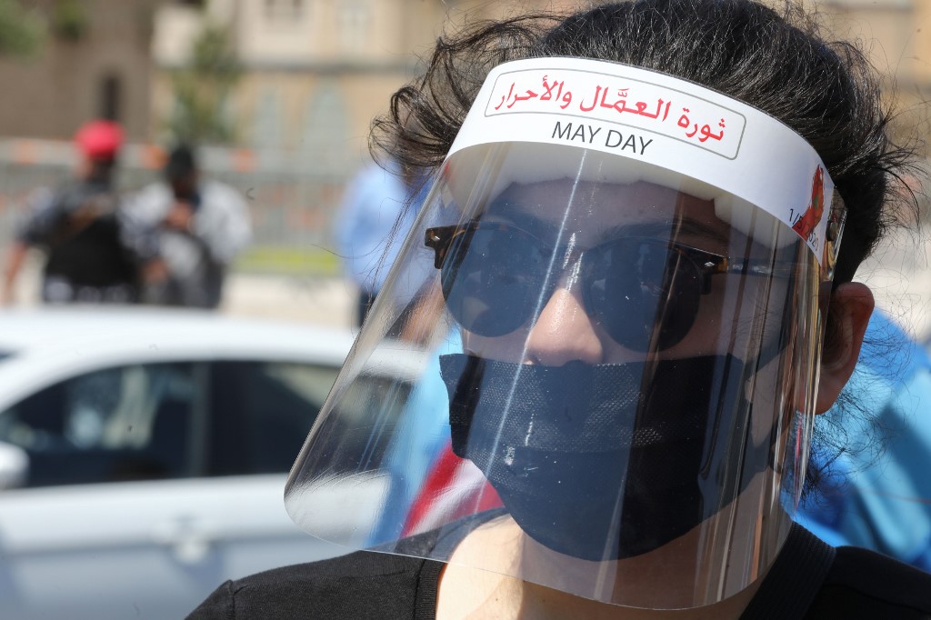 A Lebanese anti-government protester wearing protective gear amid the COVID-19 pandemic bearing the inscription "the revolution of the workers and of the free", takes part in a demonstration in downtown Beirut against the growing economic hardship, on May 1, 2020, marking International Workers' Day (Labour Day). ANWAR AMRO / AFP