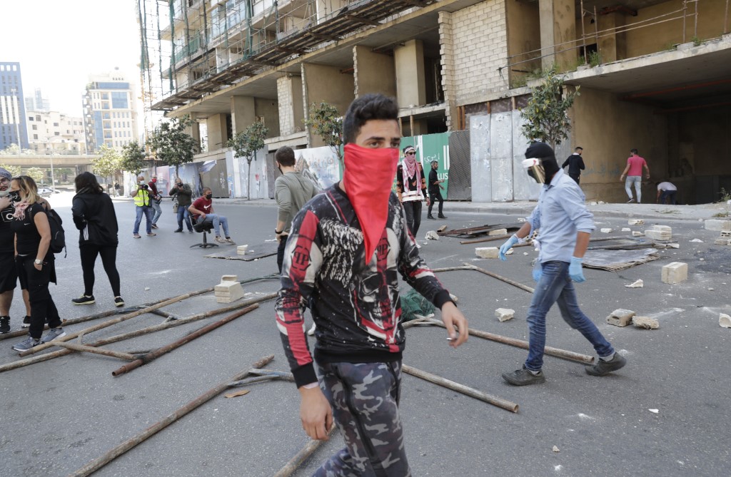 Lebanese anti-government protesters, some wearing protective masks amid the COVID-19 pandemic, block a road during a demonstration against the growing economic hardship in downtown Beirut on May 1, 2020, marking International Workers' Day (Labour Day). ANWAR AMRO / AFP