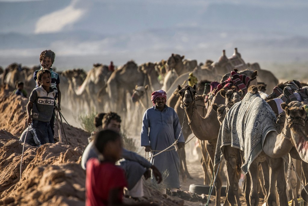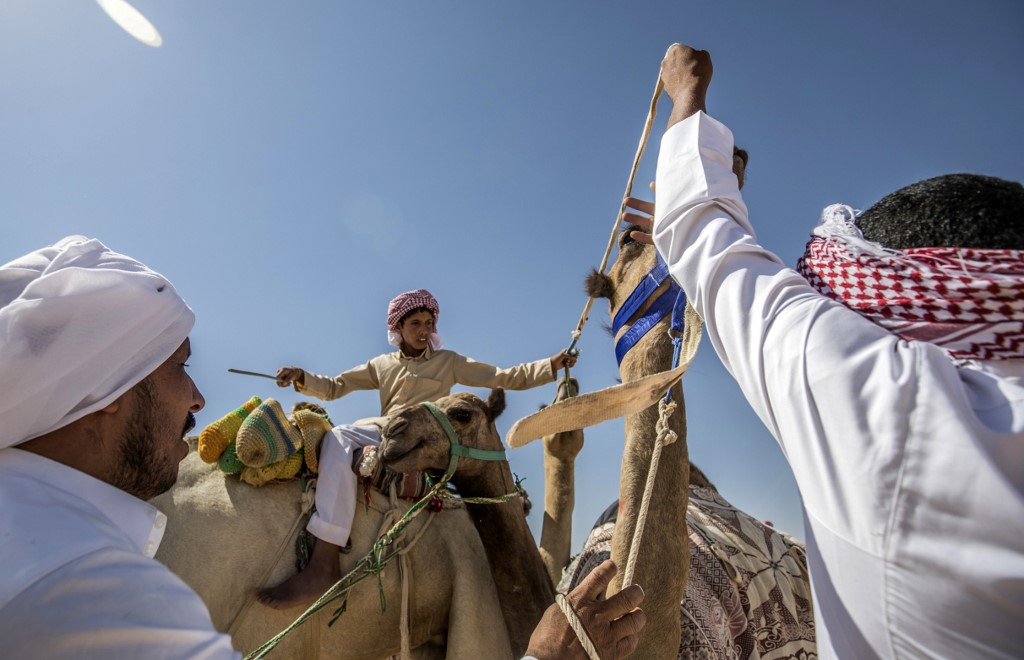 Bedouins prepare their camels for a race in Egypt's South Sinai desert on September 12, 2020, after more than six month of hiatus due to the coronavirus outbreak. KHALED DESOUKI / AFP