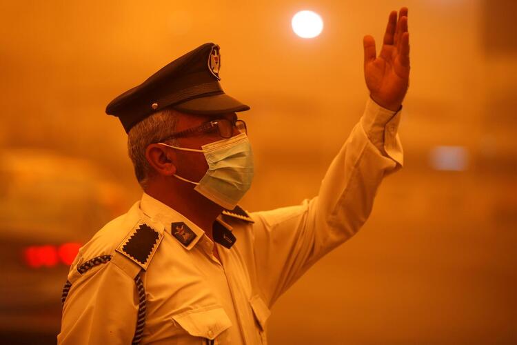 An Iraqi policeman directs traffic during a severe dust storm in the capital Baghdad on May 1, 2022. Flights were grounded today due to poor visibility at airports serving the capital Baghdad and the Shiite holy city of Najaf, with the phenomenon expected to continue into tomorrow, according to the weather service. (Photo by AHMAD AL-RUBAYE / AFP)
