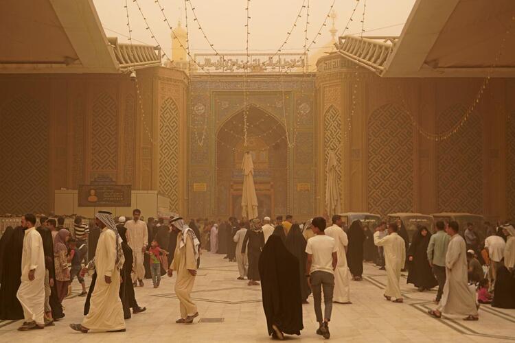Iraqis visit the Imam Ali shrine during a sandstorm in Iraq's holy city of Najaf on May 5, 2022. Iraq is yet again covered in a thick sheet of orange as it suffers the latest in a series of dust storms that have become increasingly common. Iraq was hammered by a series of such storms in April, grounding flights and leaving dozens hospitalized with respiratory problems. (Photo by Qassem al-KAABI / AFP)