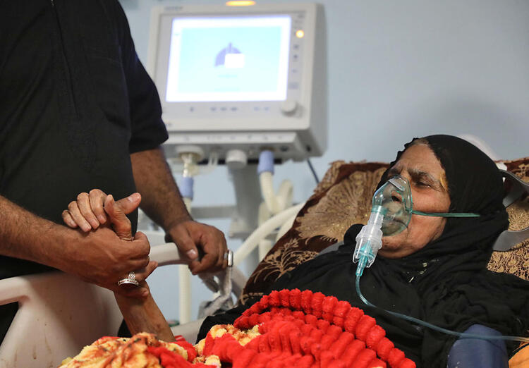 An Iraqi woman receives treatment at an emergency ward in Iraq's southern city of Nasiriyah as thousands were hospitalized across the country during a heavy sandstorm on May 5, 2022. Iraq is yet again covered in a thick sheet of orange as it suffers the latest in a series of dust storms that have become increasingly common. (Photo by Asaad NIAZI / AFP)