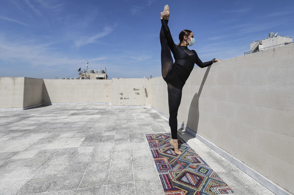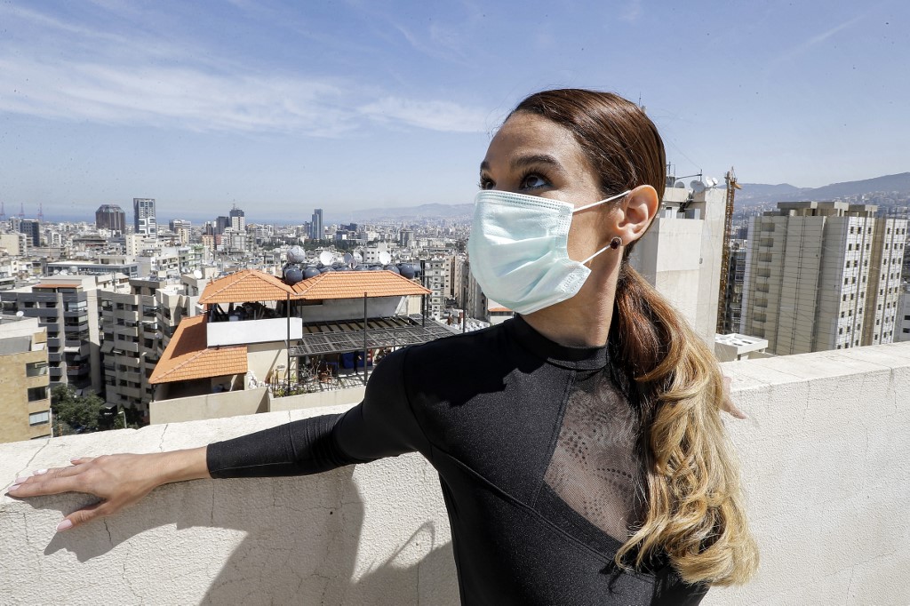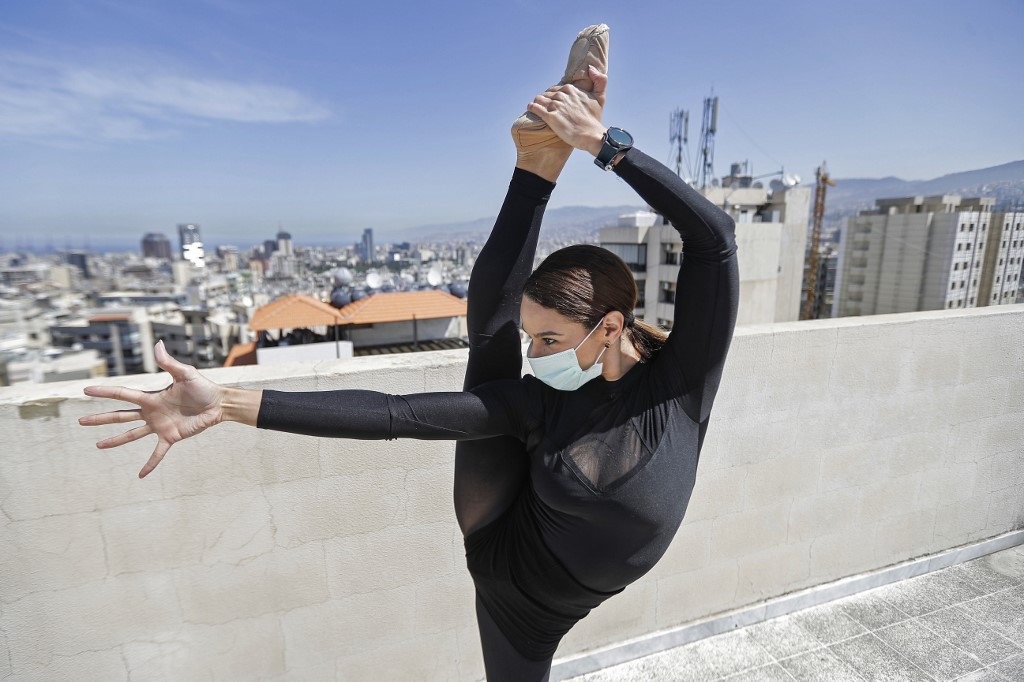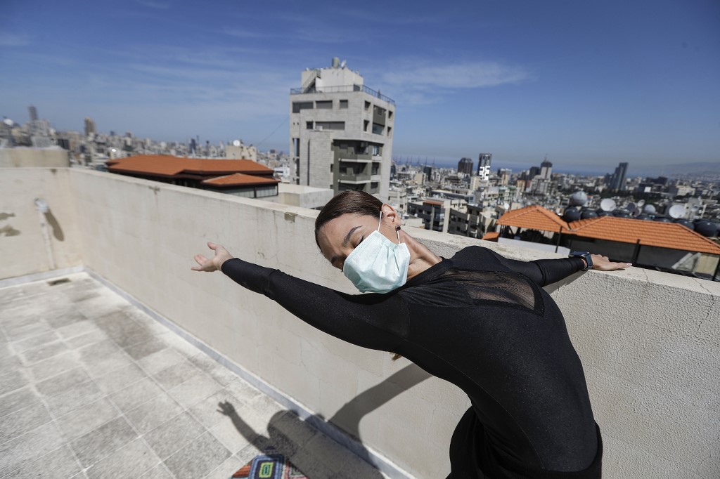She practices while wearing a surgical mask on the roof of her apartment building in the suburb of Dekwaneh on the eastern outskirts of Lebanon's capital Beirut.