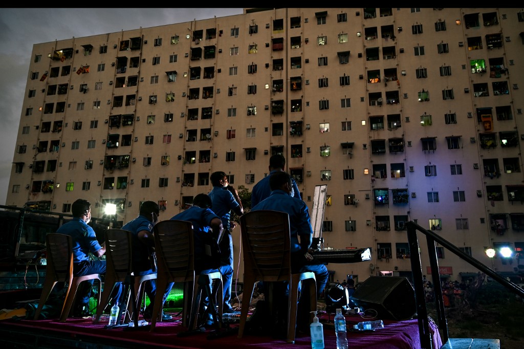 The police band mounted on an open flatbed truck for a makeshift stage sang two songs to cheer up the Maradana residents who came out on their balconies to watch the live performance.