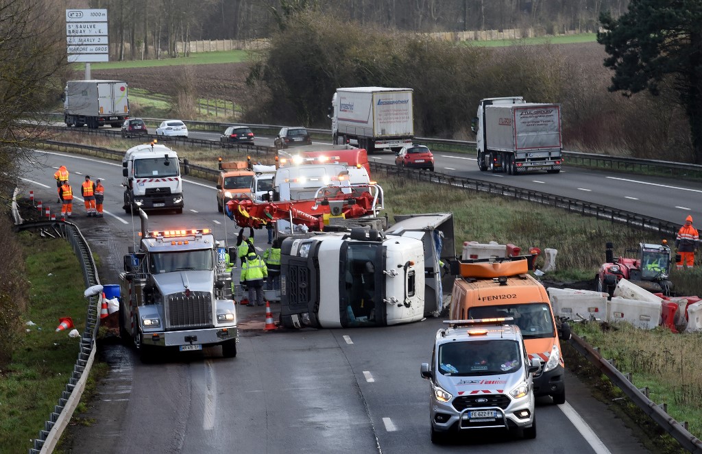 Rescuers work on the A2 motorway in Marly, northern France, after a truck was tipped over in the early morning from strong winds brought by storm Ciara on February 10, 2020. Hundreds of flights and train services were cancelled on February 10 as Storm Ciara sweeps over northwest Europe packing powerful winds, and leaving swatches of Europe without power after unleashing torrential rain and causing flash flooding. FRANCOIS LO PRESTI / AFP