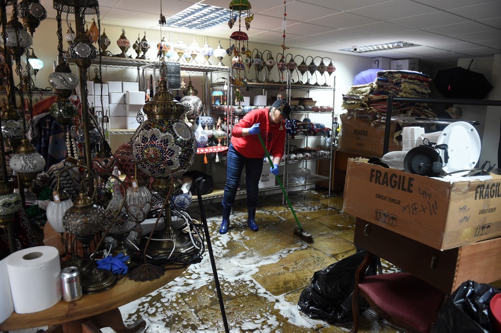 A woman sweeps water from the floor during the clean-up efforts at a business in Hebden Bridge, northern England, on February 10, 2020 after the flooding brought by Storm Ciara. Storm Ciara grounded hundreds of flights Monday and left swatches of Europe without power after unleashing torrential rain and causing flash flooding that cancelled football matches in Britain. Oli SCARFF / AFP