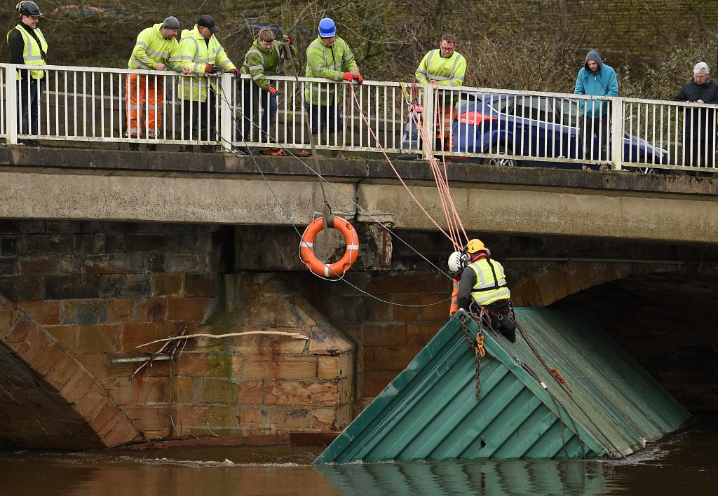 Workers secure a shipping container, lodged under the Rastrick Bridge, after it floated down the River Calder in Brighouse, northern England, on February 10, 2020 after the flooding brought on by Storm Ciara. Storm Ciara grounded hundreds of flights Monday and left swatches of Europe without power after unleashing torrential rain and causing flash flooding that cancelled football matches in Britain. Oli SCARFF / AFP