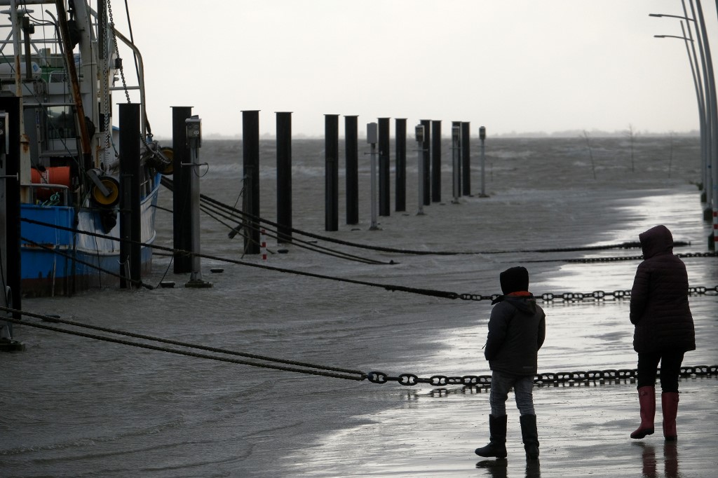 People walk near fish trawlers at the flooded harbor of Wremen, on the North Sea near Bremerhaven, northern Germany, on Febuary 11, 2020. Fierce winds and heavy rains claimed at least six lives across northern Europe on February 11, 2020, as Storm Ciara disrupted travel, grounded hundreds of flights, flooded roads and left vast areas without power. Patrik Stollarz / AFP