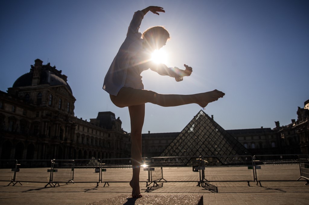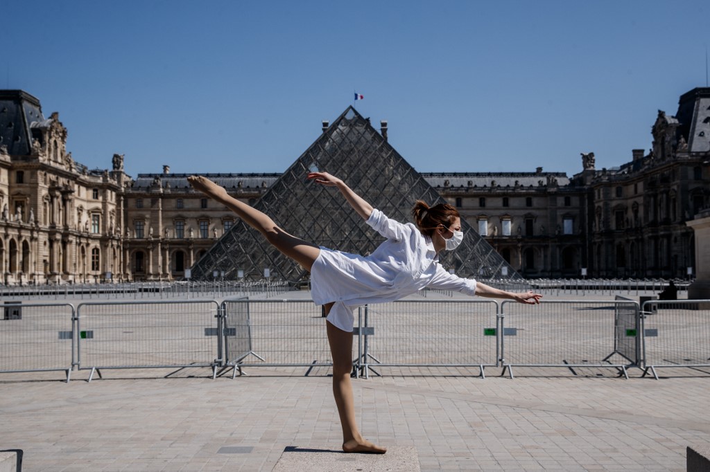 Syrian dancer and choreographer Yara al-Hasbani performs a dance in front the Louvre museum pyramid in Paris on April 22, 2020, on the 37th day of a strict lockdown in France to stop the spread of COVID-19 (novel coronavirus). Yara al-Hasbani was putting the finishing touches to her make-up for a performance of "Romeo and Juliet" in Damascus when she found out her father had been tortured to death. Sameer Al-DOUMY / AFP