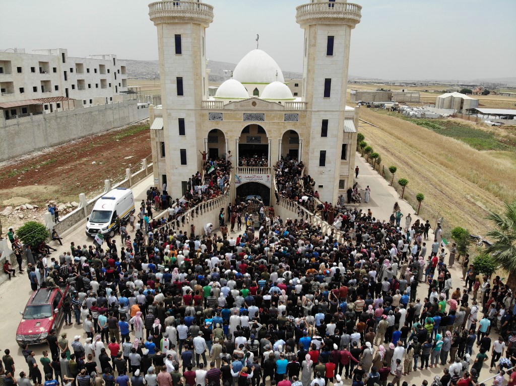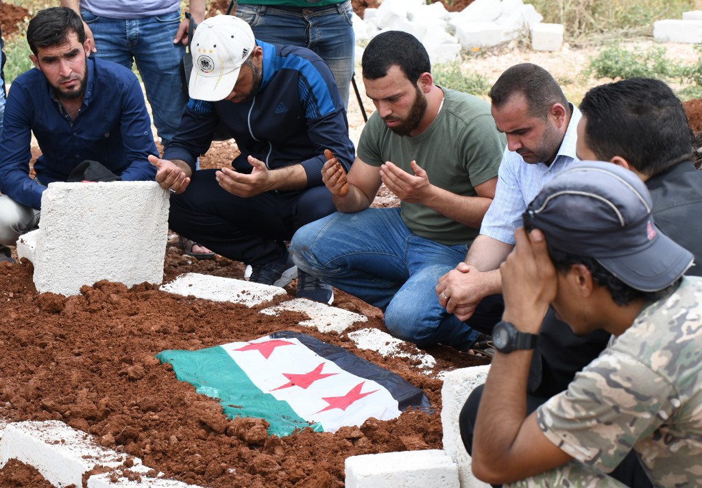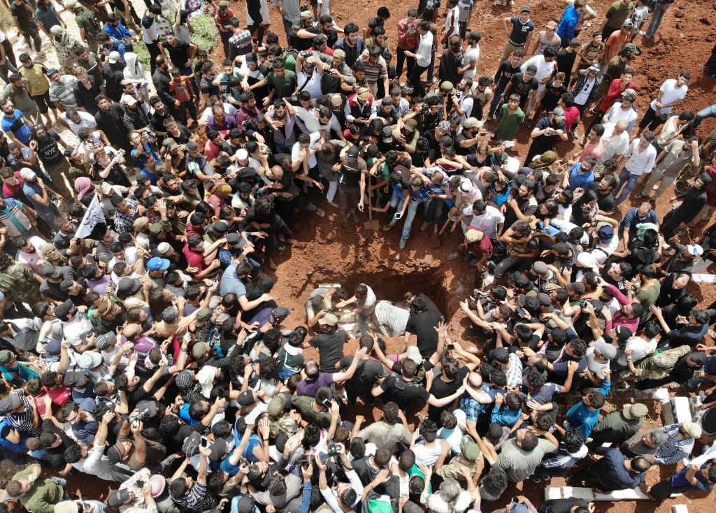 A picture taken with a drone on June 9, 2019 shows Syrians attending the burial of late rebel fighter Abdel-Basset al-Sarout in al-Dana in Syria's jihadist-controlled Idlib region, near the border with Turkey. OMAR HAJ KADOUR / AFP