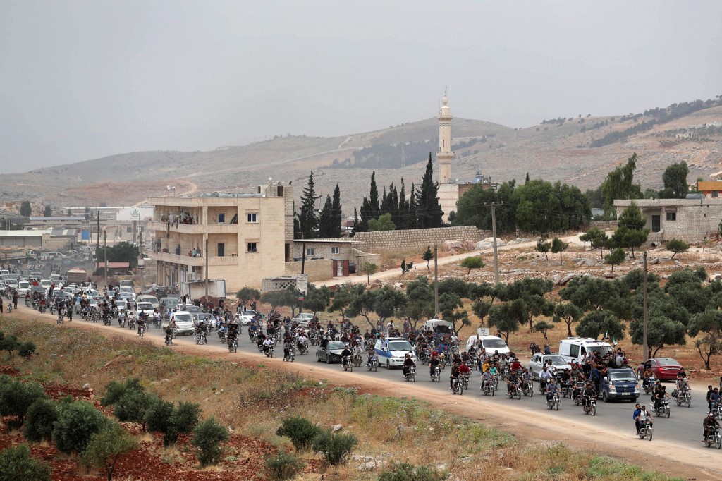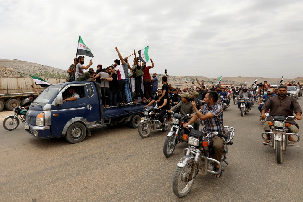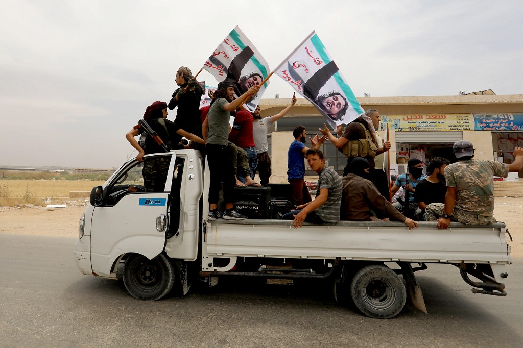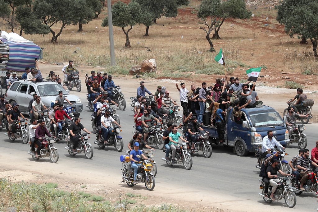 A convoy of Syrians follow the truck carrying the coffin of late rebel fighter Abdel-Basset al-Sarout on June 9, 2019, near the Bab al-Hawa crossing point, northwestern Syria, on the way to his funeral after crossing the border from Turkey where he was receiving treatment following his injury earlier this week. OMAR HAJ KADOUR / AFP