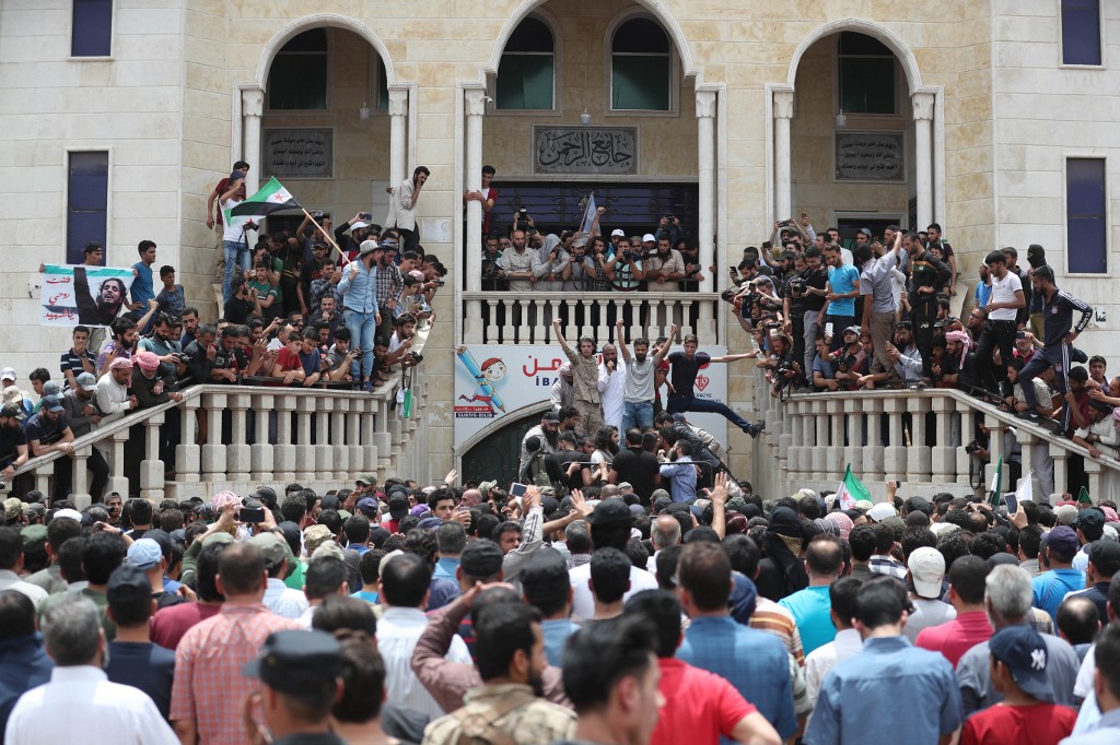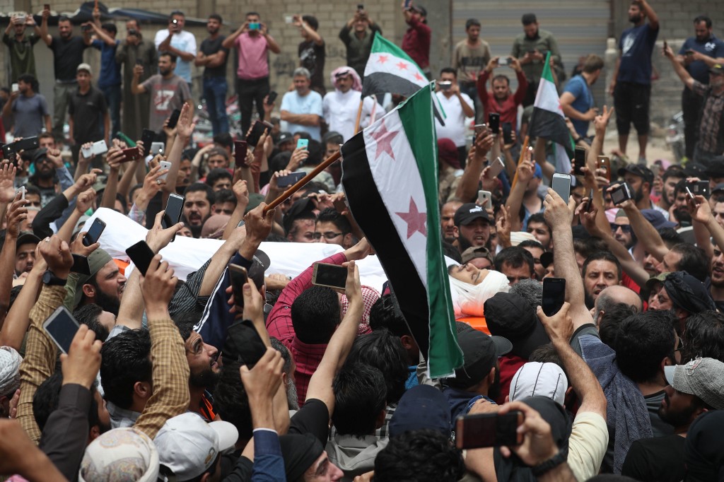 A picture taken on June 9, 2019 shows Syrians waving rebel flags during the funeral of late rebel fighter Abdel-Basset al-Sarout in al-Dana in Syria's jihadist-controlled Idlib region, near the border with Turkey. OMAR HAJ KADOUR / AFP