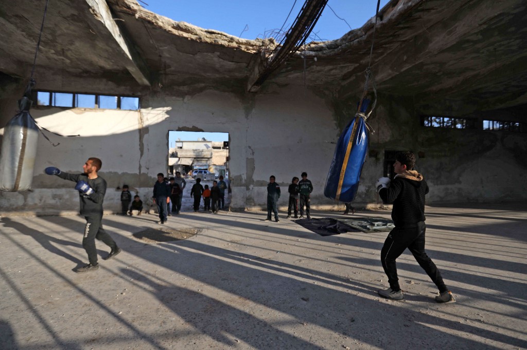 Displaced Syrian boxer Ahmad Dwara trains youth inside a damaged building in the town of Atareb in the rebel-held western countryside of Syria's Aleppo province, on February 11, 2021. AAREF WATAD / AFP