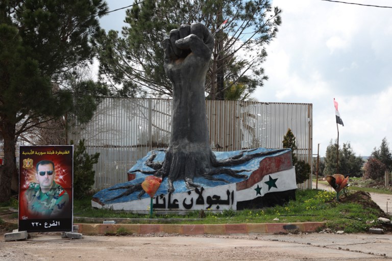 A portrait of the Syrian President Bashar al-Assad stands near a sculpture in the Syrian town of Quneitra, in the Golan Heights on March 26, 2019. The writing in Arabic reads: "The Golan is ours". Louai Beshara / AFP