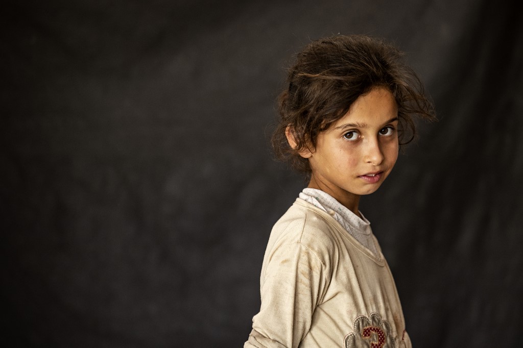 A girl poses for a picture while at a school building where Syrians -- displaced from the area of Ras al-Ain by the Turkish offensive on the northeast -- are staying in the city of Hasakah, on June 30, 2020. Delil SOULEIMAN / AFP