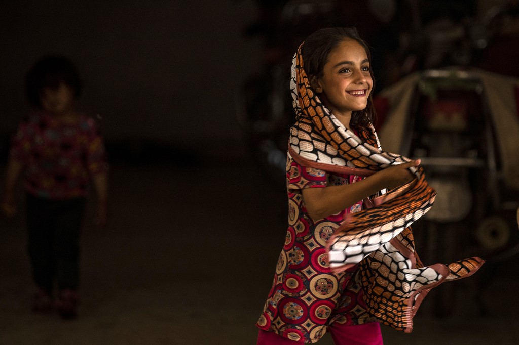 A girl holds her shawl while walking in a hallway at a school building where Syrians -- displaced from the area of Ras al-Ain by the Turkish offensive on the northeast -- are staying in the city of Hasakah, on June 30, 2020. Delil SOULEIMAN / AFP