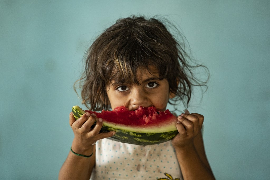 A girl eats a watermelon slice while at a school building where Syrians -- displaced from the area of Ras al-Ain by the Turkish offensive on the northeast -- are staying in the city of Hasakah, on June 30, 2020. Delil SOULEIMAN / AFP
