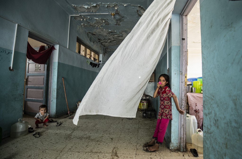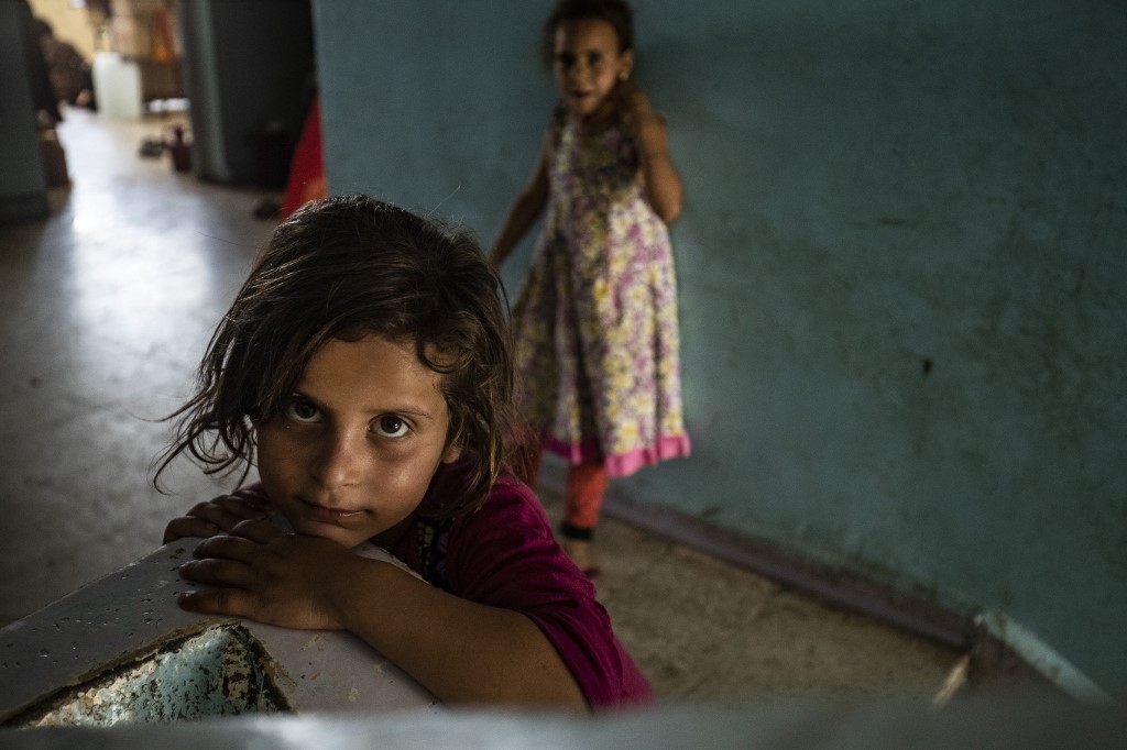 A girl looks on while standing by a doorway at the hallway of a school building where Syrians -- displaced from the area of Ras al-Ain by the Turkish offensive on the northeast -- are staying in the city of Hasakah, on June 30, 2020. Delil SOULEIMAN / AFP