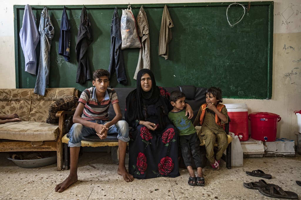 A woman sits with children as they pose for a picture at a former classroom in a school building where Syrians -- displaced from the area of Ras al-Ain by the Turkish offensive on the northeast -- are staying in the city of Hasakah, on June 30, 2020. Delil SOULEIMAN / AFP