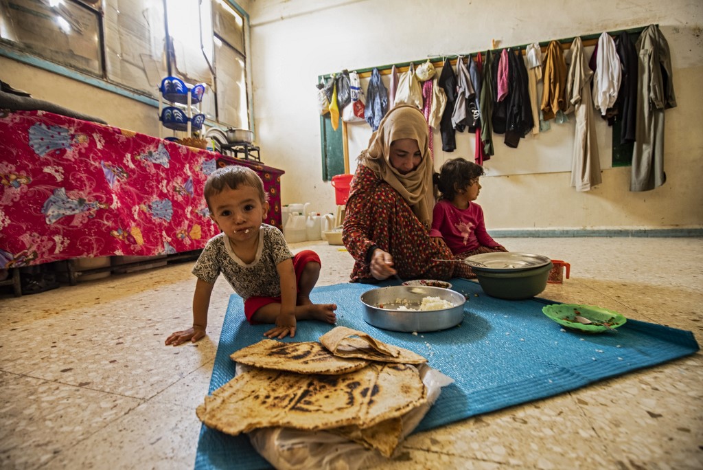A woman feeds a child while sitting on the floor at a former classroom in a school building where Syrians -- displaced from the area of Ras al-Ain by the Turkish offensive on the northeast -- are staying in the city of Hasakah, on June 30, 2020. Delil SOULEIMAN / AFP