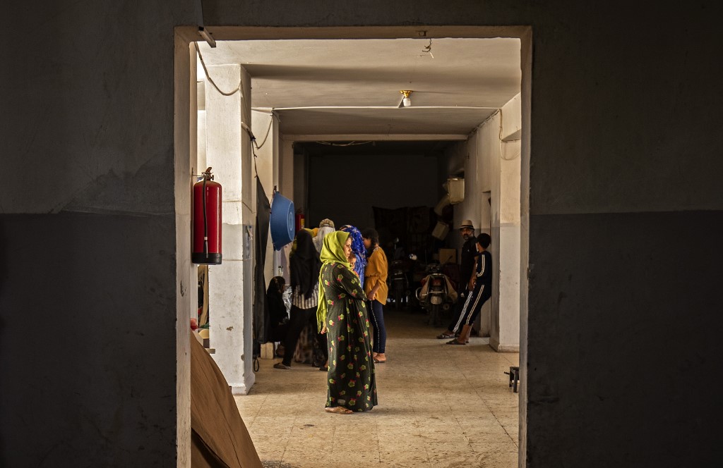 People stand in a hallway at a school building where Syrians -- displaced from the area of Ras al-Ain by the Turkish offensive on the northeast -- are staying in the city of Hasakah, on June 30, 2020. Delil SOULEIMAN / AFP