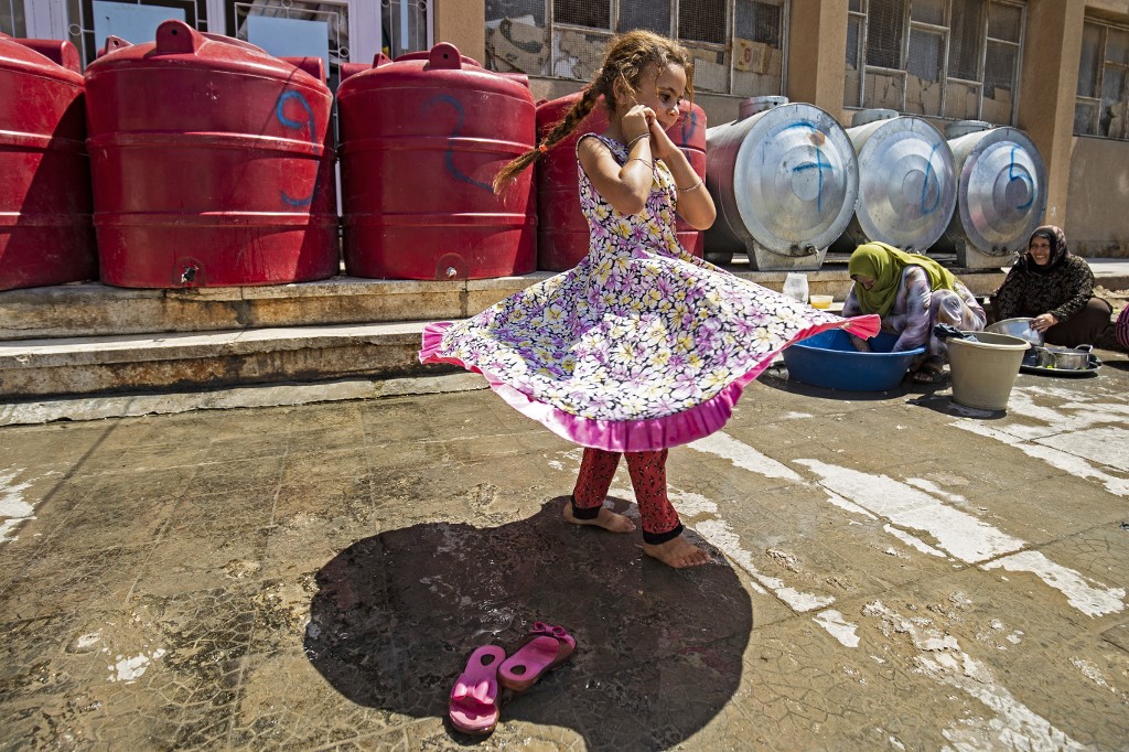 A girl walks past women washing pots and pans by cisterns at the yard of a school building where Syrians -- displaced from the area of Ras al-Ain by the Turkish offensive on the northeast -- are staying in the city of Hasakah, on June 30, 2020. Delil SOULEIMAN / AFP