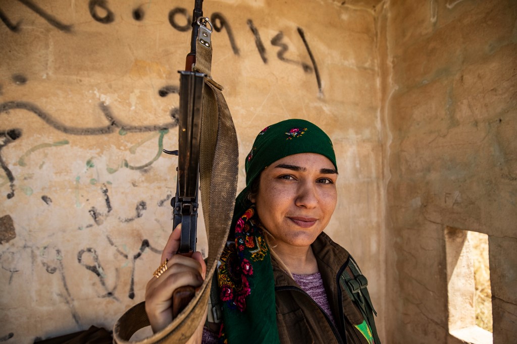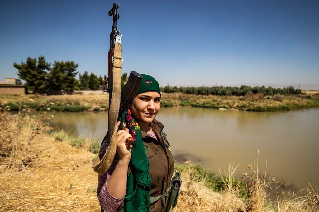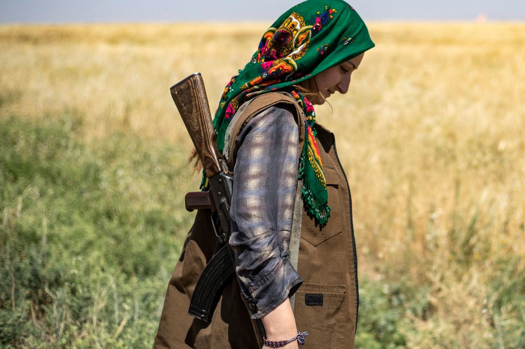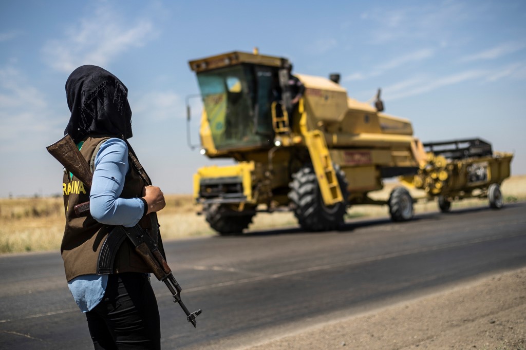 Kurdish female volunteer guards a wheat field, against threats by jihadists to burn the crops, during harvest season in the countryside east of Qamishli in Syria's northeastern Hasakah province.