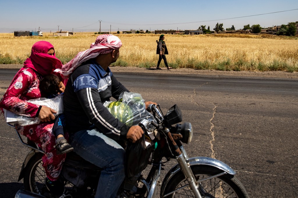 A family rider a motorcycle past a Kurdish female volunteer, from the newly formed Community Protection Forces, as she patrols a wheat field, against threats by jihadists to burn the crops, during harvest season on June 13, 2020, in the countryside east of Qamishli in Syria's northeastern Hasakah province. Delil SOULEIMAN / AFP