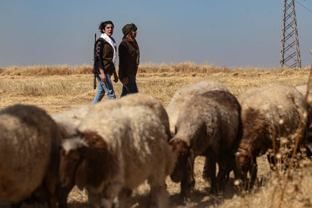Kurdish female volunteers, from the newly formed Community Protection Forces, walk next to a herd of sheep as they patrol a wheat field, against threats by jihadists to burn the crops, during harvest season on June 13, 2020, in the countryside east of Qamishli in Syria's northeastern Hasakah province. Delil SOULEIMAN / AFP