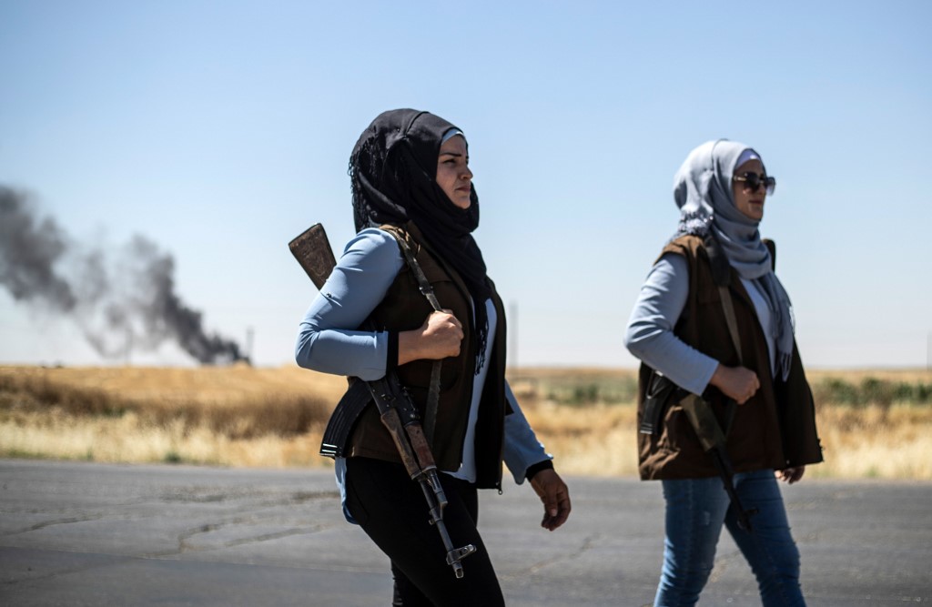 Smoke billows from an oil field as Kurdish female volunteers, from the newly formed Community Protection Forces, guard a wheat field, against threats by jihadists to burn the crops, during harvest season on June 13, 2020, in the countryside east of Qamishli in Syria's northeastern Hasakah province. Delil SOULEIMAN / AFP