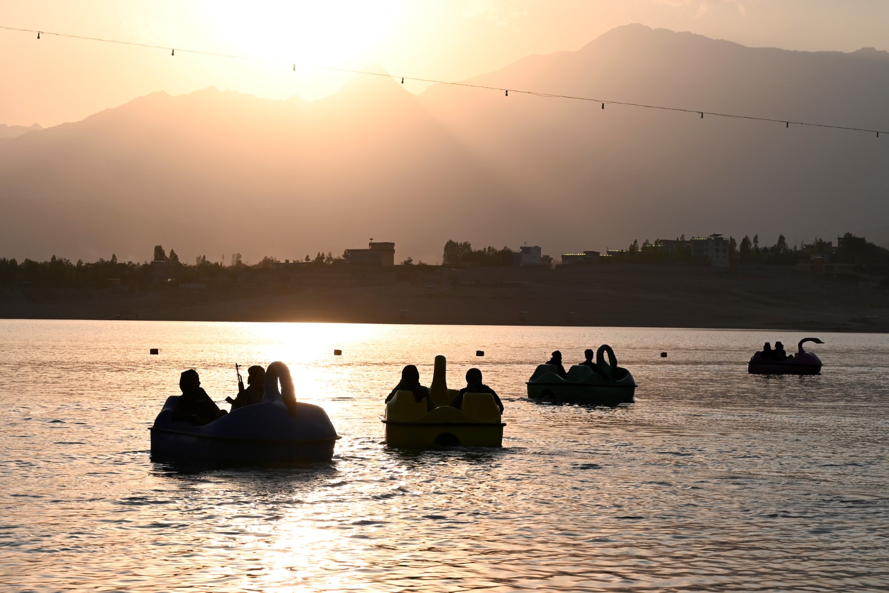 The pictures show activists riding swan-themed ships on the water at Band-e Amir National Park – once a hotspot for international travelers and domestic tourists – in central Afghanistan yesterday.