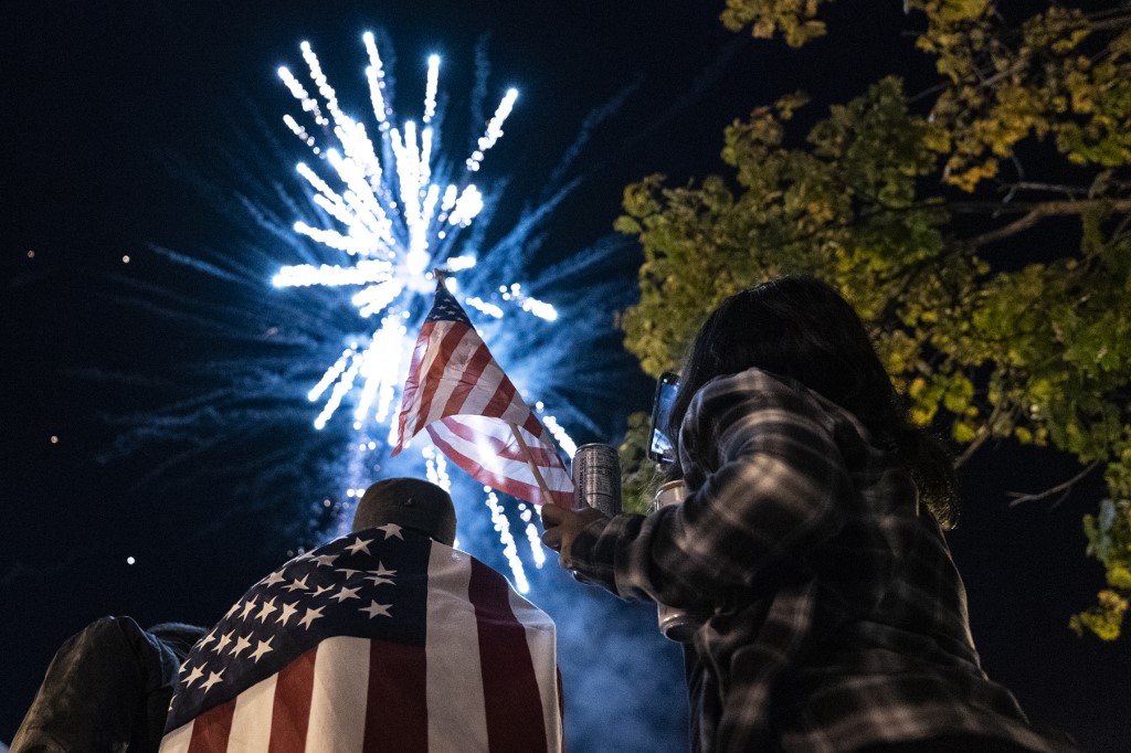 Supporters of US President-elect Joe Biden watch fireworks as they celebrate near the White House on November 7, 2020 in Washington, D.C. Democrat Joe Biden urged unity on November 7 and promised "a new day for America" in his first national address since he won the tense US election and ended the historically turbulent and divisive era of Donald Trump. Alex Edelman / AFP