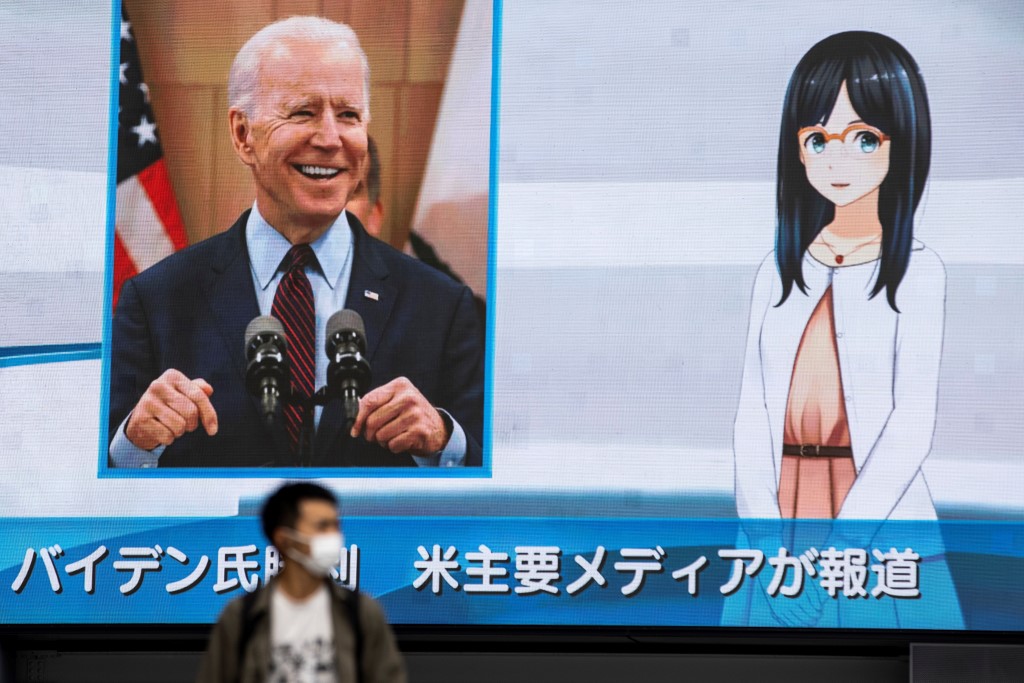 A man wearing a face mask walks in front of a huge screen showing a news programme featuring US Democratic candidate Joe Biden's win in the US presidential election, in Tokyo on November 8, 2020. Behrouz MEHRI / AFP
