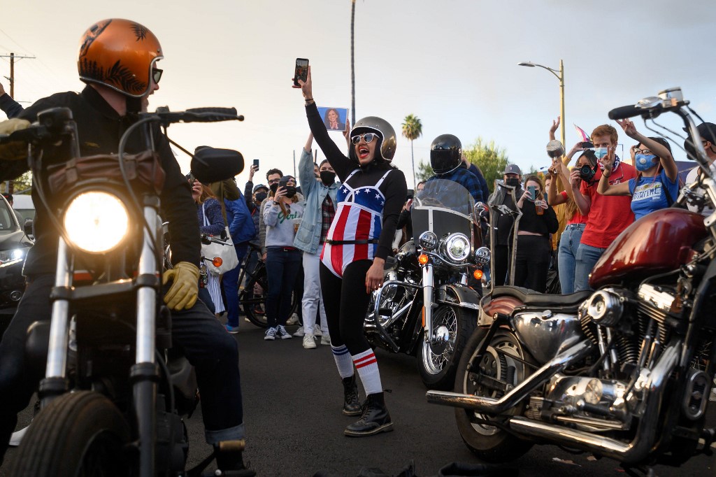 People celebrate the results of the 2020 Presidential election along West Hollywood on November 7, 2020 in Los Angeles, California. Emma McIntyre / GETTY IMAGES NORTH AMERICA / Getty Images via AFP