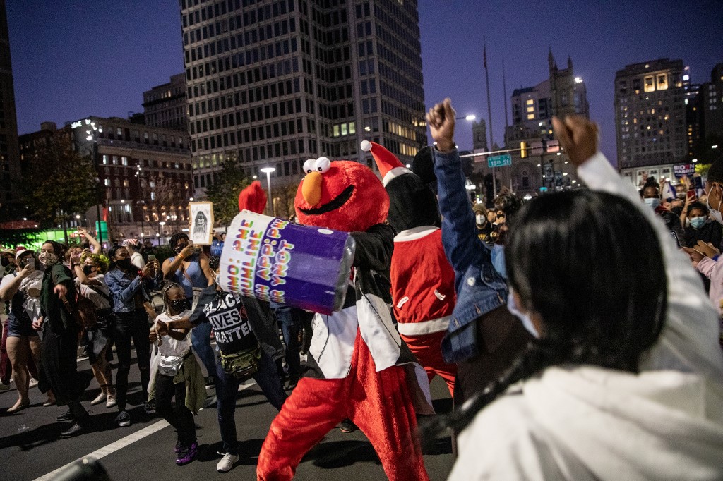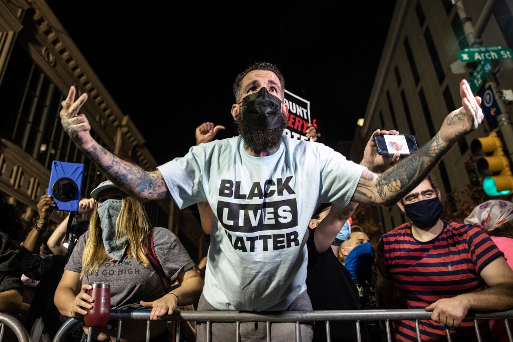 People celebrating the election victory of Joe Biden taunt supporters of U.S President Donald Trump from across the street while celebrating outside the Philadelphia Convention Center after Joe Biden was declared winner of the 2020 presidential election on November 07, 2020 in Philadelphia, Pennsylvania. Chris McGrath / GETTY IMAGES NORTH AMERICA / Getty Images via AFP