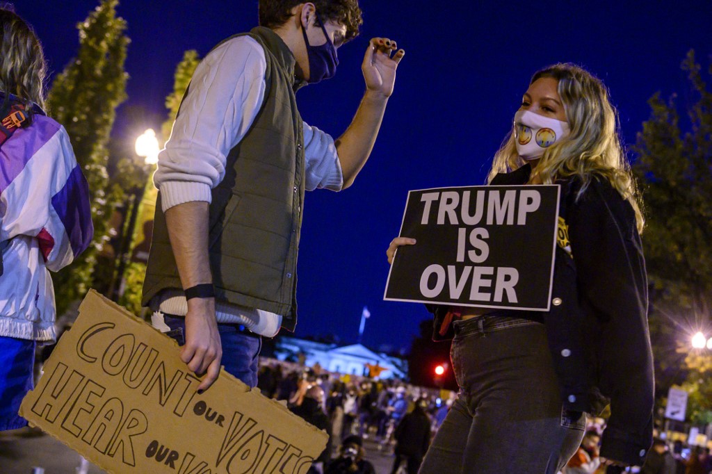 Young activists and Democratic party candidate supporters gather and dance on Black Lives Matter Plaza just outside of the White House (background) on November 4, 2020 in Washington DC. Democrat Joe Biden took a huge step Wednesday to capturing the White House, with wins in Michigan and Wisconsin bringing him close to a majority, but President Donald Trump responded with a diatribe alleging mass fraud and demanding a halt to vote counting. Eric BARADAT / AFP