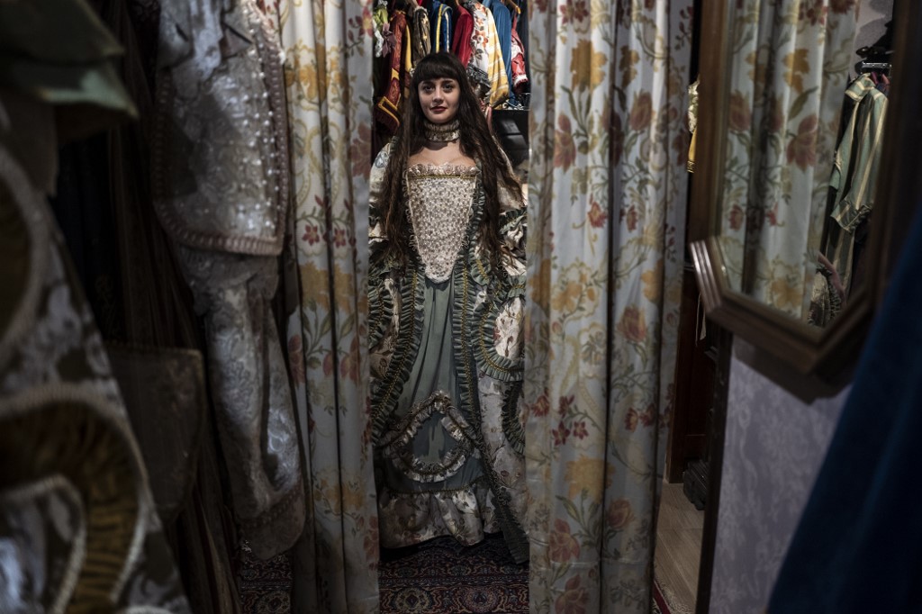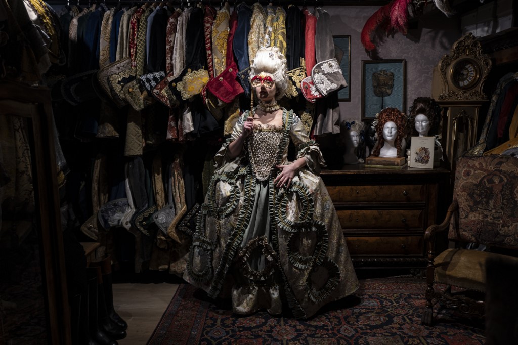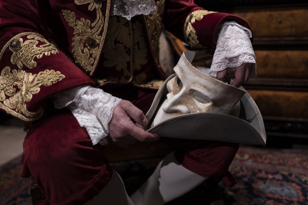 A reveller poses with a traditional carnival costume in 'La Bauta' shop in Venice on February 6, 2021, as the traditional Venice carnival is being cancelled due to the Covid-19 pandemic. Marco Bertorello / AFP