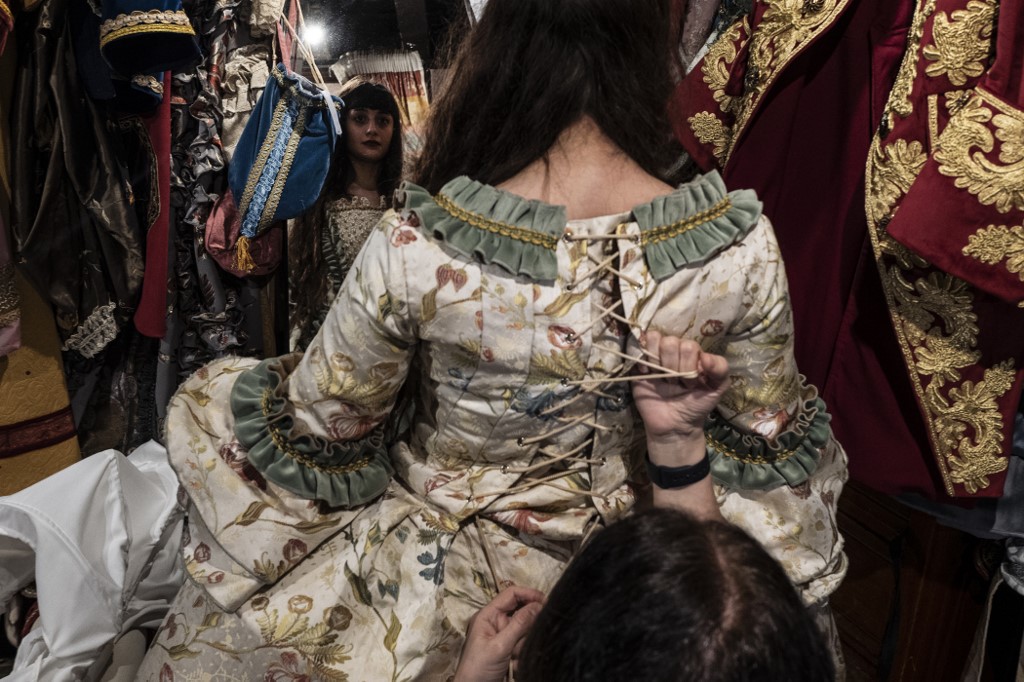 An employee (Front R) helps a reveller put on a traditional carnival costume in 'La Bauta' shop in Venice on February 6, 2021, as the traditional Venice carnival is being cancelled due to the Covid-19 pandemic. Marco Bertorello / AFP
