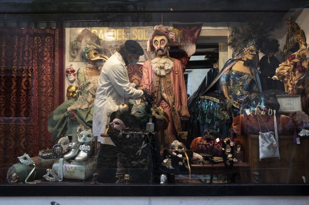 Mask artisan Hamid Seddighi sets a traditional carnival costume in the shop window of his shop and laboratory 'Ca del Sol' in Venice on February 6, 2021, as the traditional Venice carnival is being cancelled due to the Covid-19 pandemic. Marco Bertorello / AFP