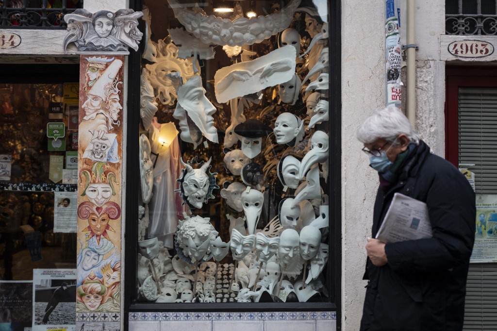 A man wearing a face mask walks past the shop and laboratory 'Ca del Sol' in Venice on February 6, 2021, as the traditional Venice carnival is being cancelled due to the Covid-19 pandemic. Marco Bertorello / AFP