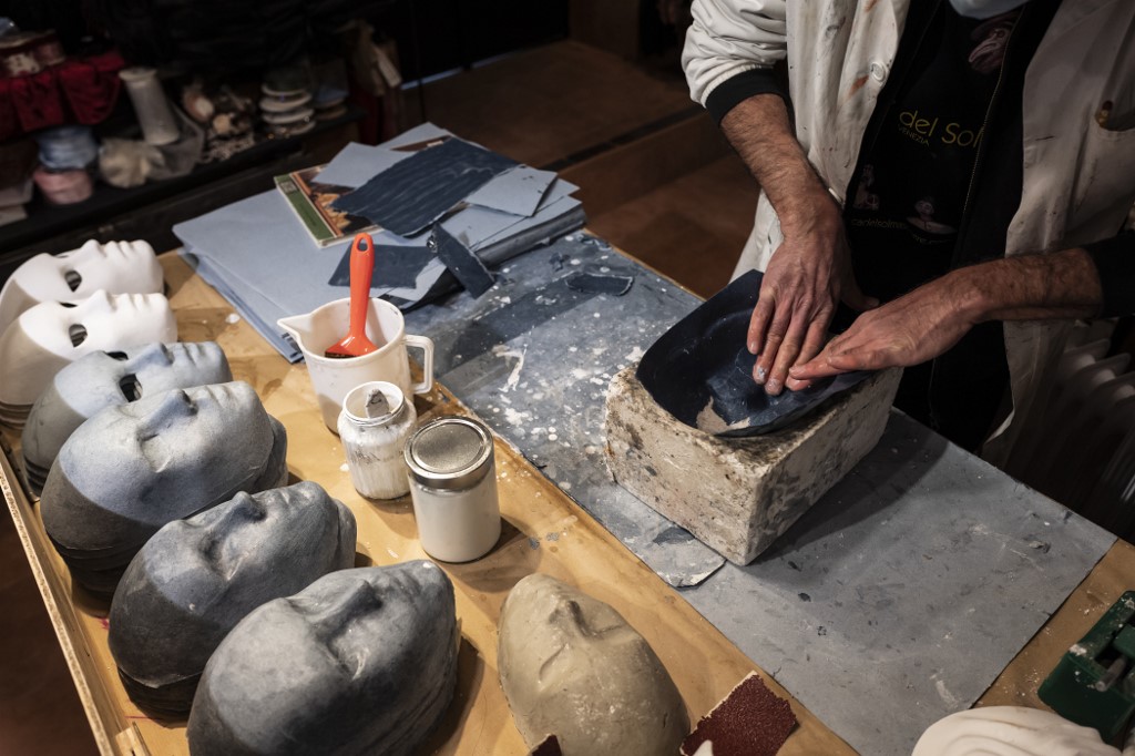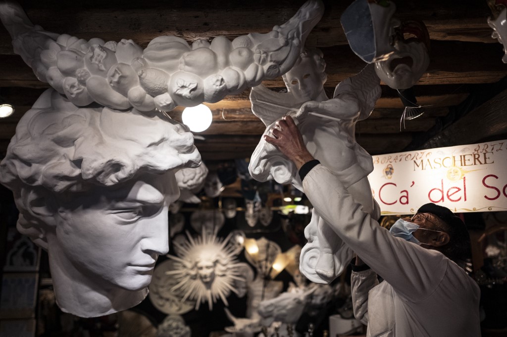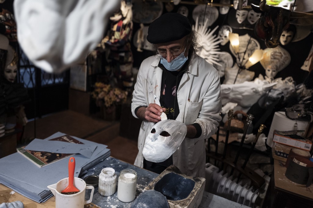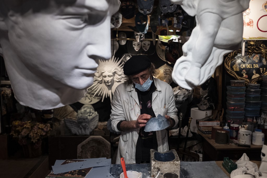 Mask artisan Hamid Seddighi works on a papier-mache mask in his laboratory 'Ca del Sol' in Venice on February 6, 2021, as the traditional Venice carnival is being cancelled due to the Covid-19 pandemic. Marco Bertorello / AFP